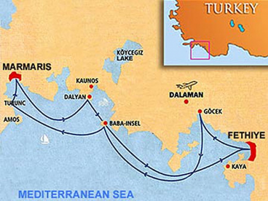 Our voyage starts in Marmaris Situated on a bay, backed by rugged pineclad mountains, Marmaris is a most attractive maritime parklands, ideal for water sports and sailing. It makes an excellent starting point for a "Blue Voyage" tour of the Aegean coastline. With plenty of provisions aboard you set sail in the craft of your choice and languidly explore the spectacular beauty of southern Turkey.