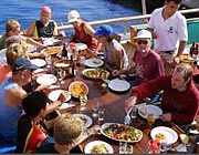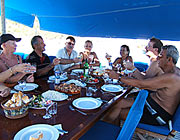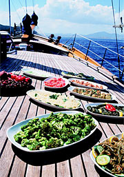 A light lunch is next in line. Meals commence with 'mezes', or starters. Vegetarians relish these dishes:- egg plant (aubergine)or zucchini salads, hot and peppery tomato salad and 'cacik', yoghurt with finely shredded cucumber and lashings of garlic. Yoghurt is often served by itself, thick and creamy it's a good accompaniment to some of the drier mezes. Other favourites are 'dolma' ; green peppers and vine leaves stuffed with savoury rice, or even octopus caught by the crew, made into a salad or battered and fried; sprinkled with lemon juice it has a piquant flavour all of its own. Your table is never without a constant supply of fresh bread, helping you to savour every last mouthful of spicy sauce.